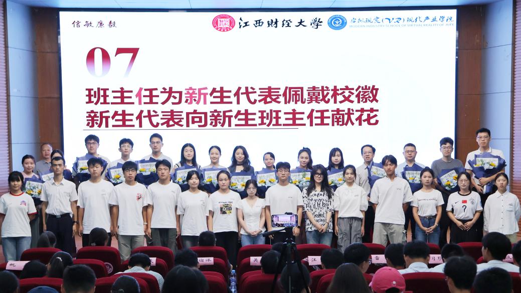 李华旸、吴洁为新生班主任颁发聘书,将“新”身份与“新”责任庄重交付。新生班主任为新生代表佩戴校徽,欢迎新生加入江财大家庭;新生代表向班主任献花,表达感恩之情。在未来的四年大学生活中,希望师生们携手共进,砥砺前行。
