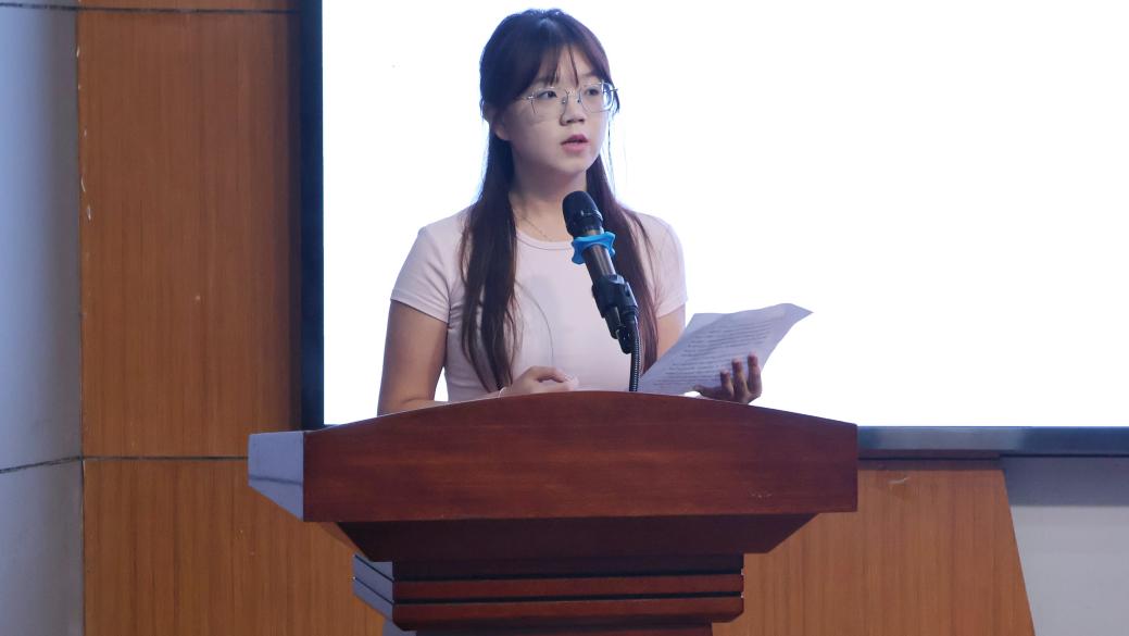 老生代表刘淑淋结合自身大学经历,向新生分享了社团工作与学生事务是重要的成长平台。鼓励新生积极欣赏课堂之外的风景;敢于“浪费”时间;以专业知识,远观世界,从容应对大学各阶段挑战,勇敢追梦。
