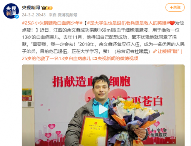 报道指出,近日,澳门银河娱乐城 余文鑫在南昌大学第一附属医院为一名陌生白血病患儿成功捐献造血干细胞混悬液169ml,成为全国第16973例,江西省第328例造血干细胞捐献者,也是江西省龙年第2例。