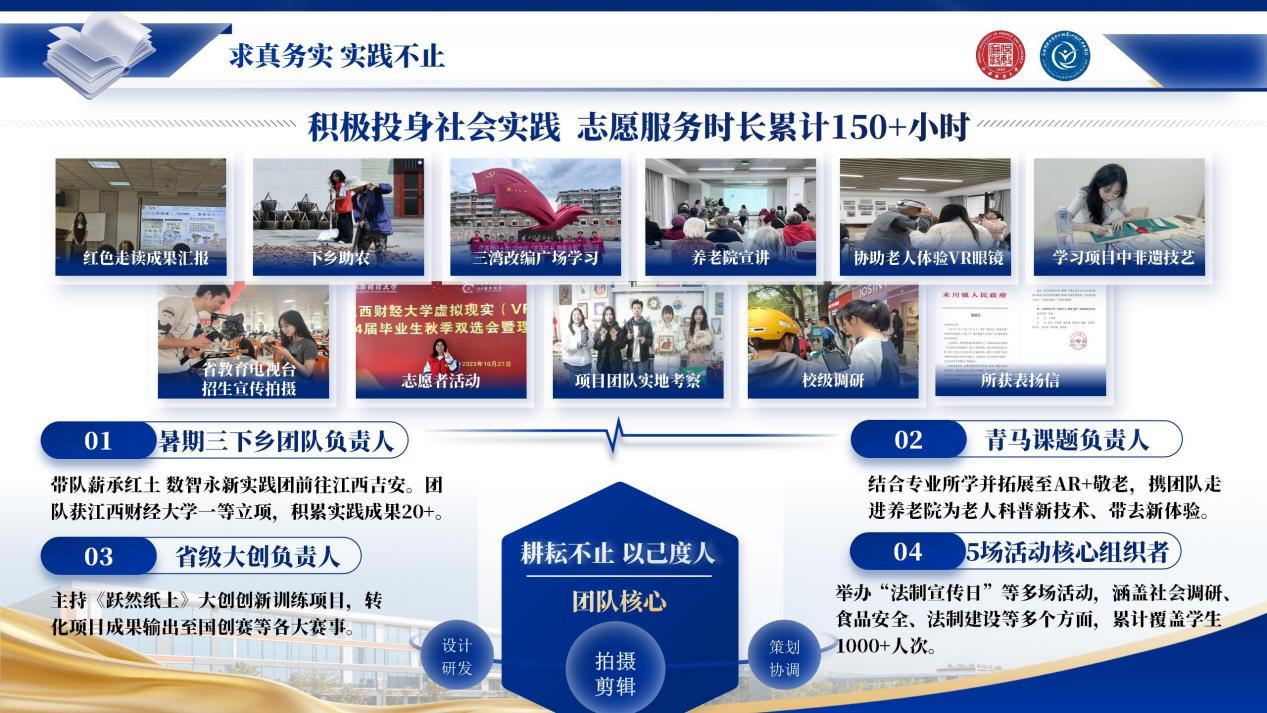 求真务实,实践不止。她先后担任行政班班长、VR澳门银河娱乐城 权益部负责人、校大自委资助服务部骨干等。在职期间恪尽职守,服务同学。她主持三项科研课题,将奇思妙想融入新技术。主持省级大创,将激光打印、AI创作与非遗剪纸相结合,打造国内首个剪纸全链路智造体系,推动非遗的传承与发展;开展青马课题,带着定制化AR产品、VR设备走进养老院进行科技助老;带领三下乡社会实践团队前往吉安投身红色文化数字化传承;在VR产业博览会上显示项目风采,汲取专业建议不断优化。同时积极承担社会责任,多次参与校内外志愿活动,累计志愿服务时长超一百五十小时。