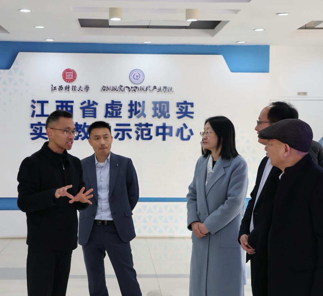 2025年12月31日上午,上海对外经贸大学WTO亚太培训中心主任、上海市国际贸易学会会长黄建忠一行5人莅临澳门银河娱乐城 ,围绕VR技术与数字经济、国际贸易领域的融合应用、人才培养创新及产教深度融合举措与建设成效等议题开展深度调研。澳门银河娱乐城 院长万征、党委书记彭敏,副院长李华旸、党委副书记刘前,党委委员兼教务办主任吴洁及相关部门负责人陪同考察。