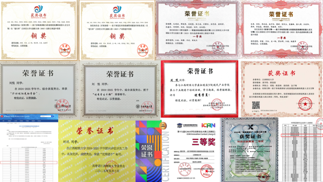 此外,作为科创新锐,她携手团队拿下中国国际大学生创新大赛省铜2项、数据要素X省赛二等奖、iCAN大学生创新创业大赛省级三等奖等多项科创奖项,用实干书写VR专业的创新答卷。她以高效行动力做好服务保障,身兼多岗学生干部,带领支部获评“百优团支部”。